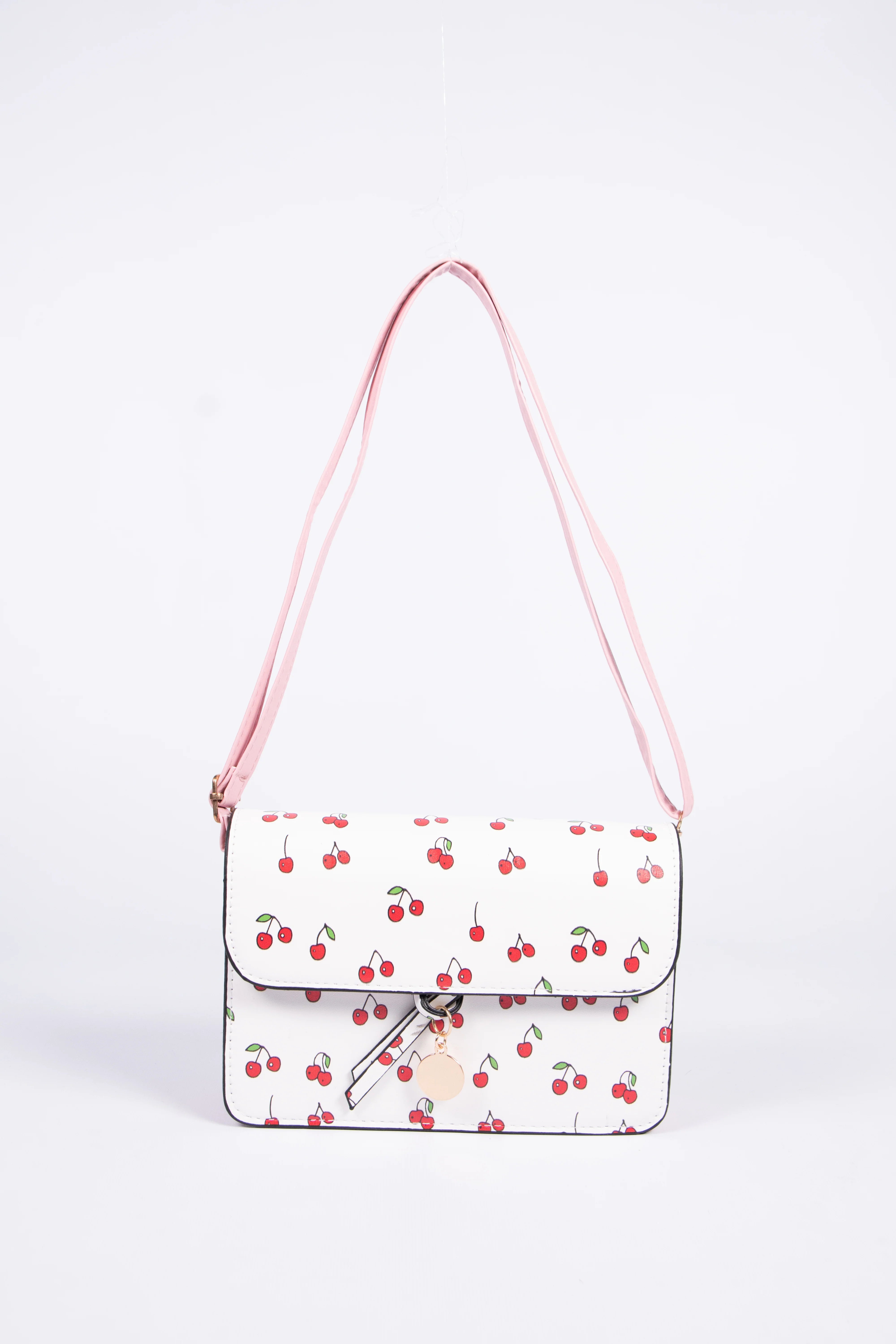 Mini bag de cerezas con detalle dorado y correa negra o rosa.