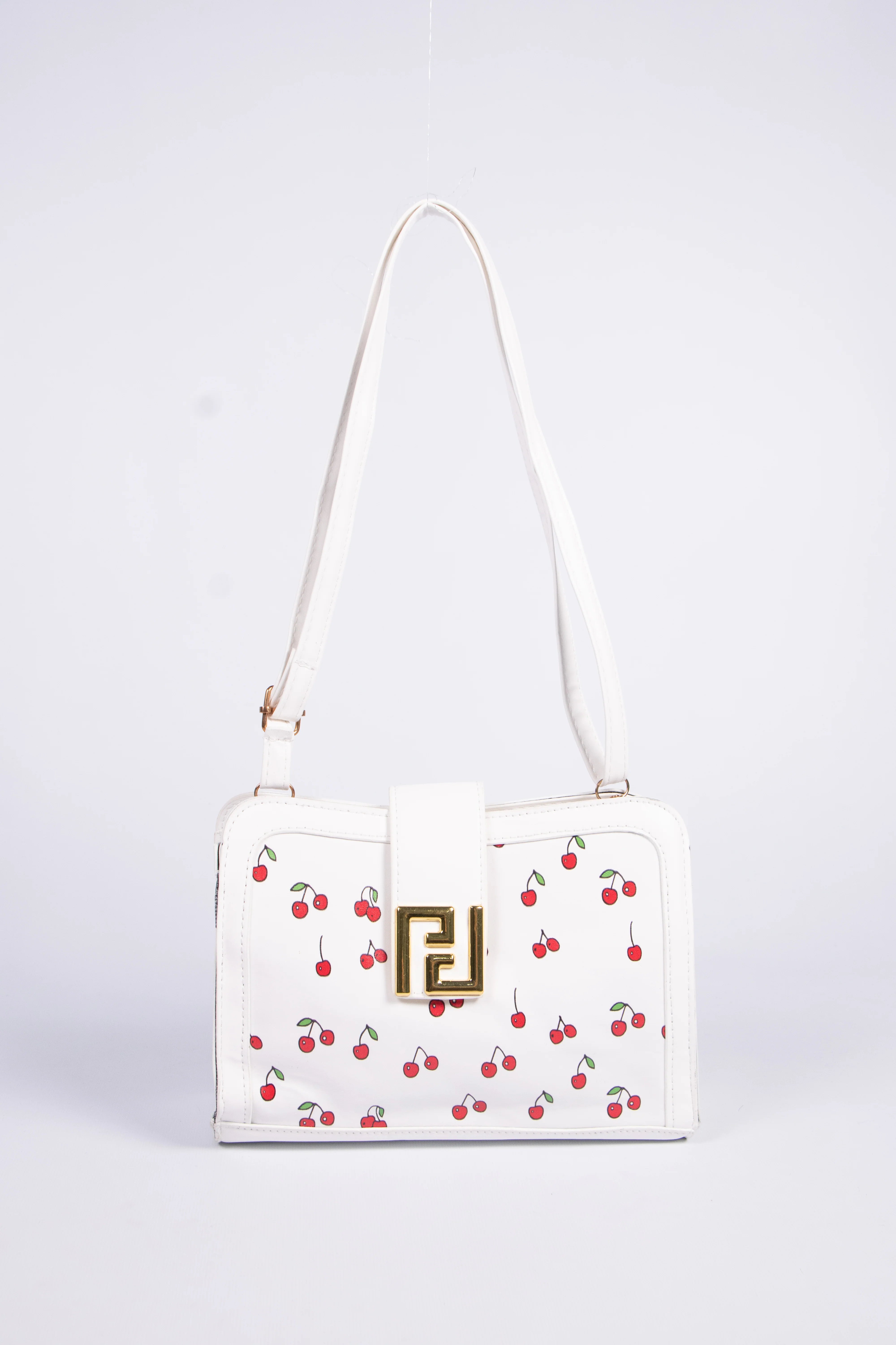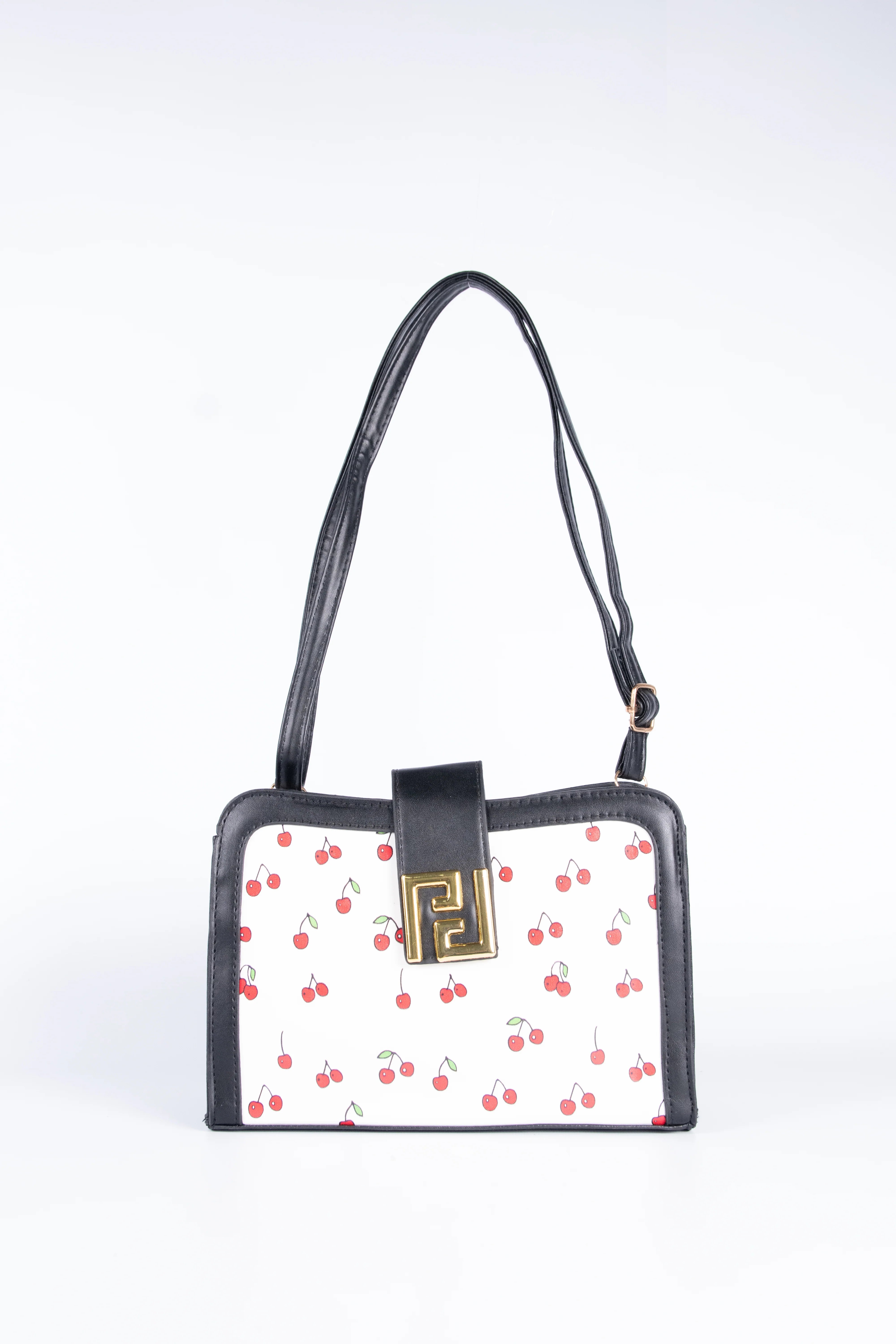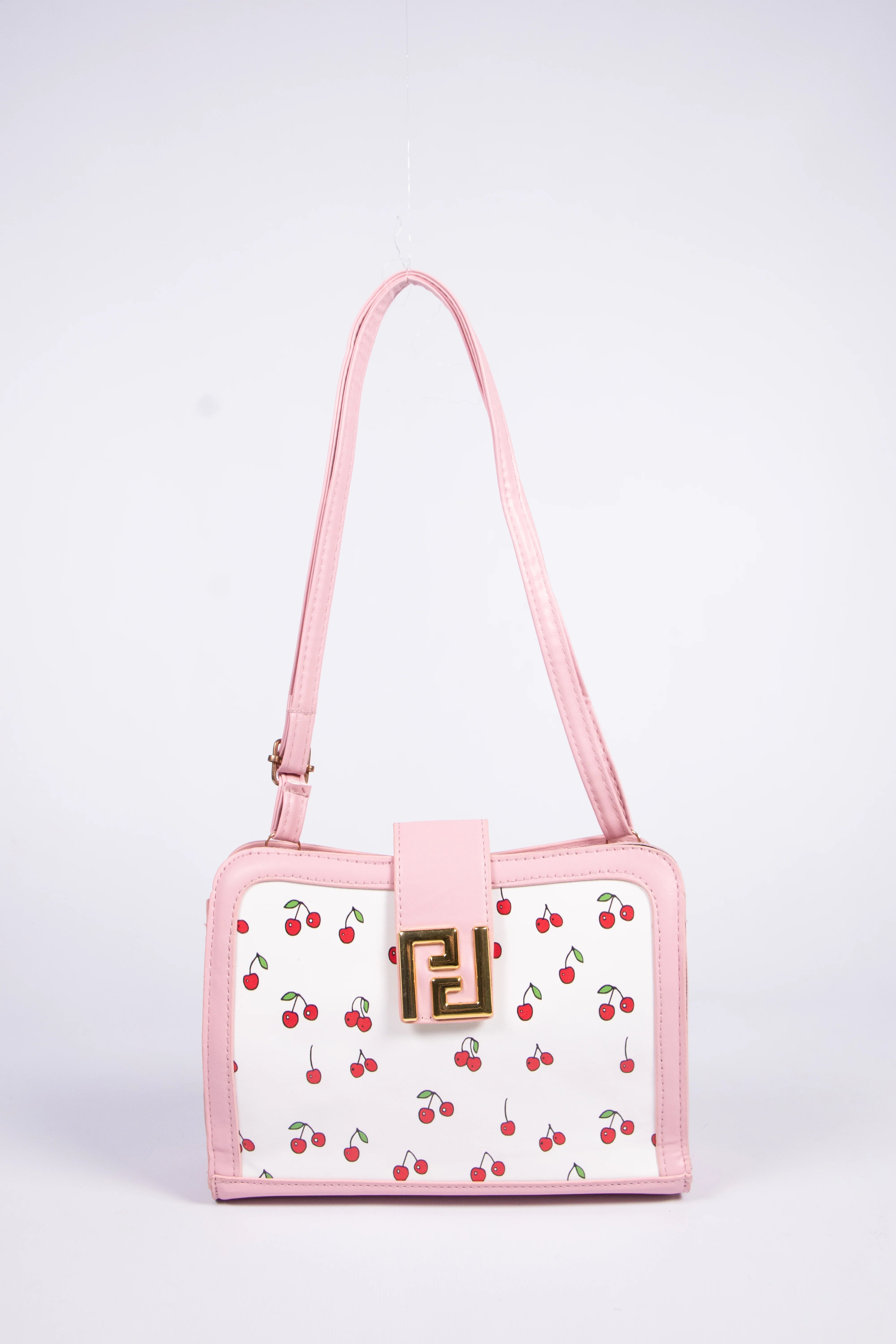Mini bag de cerezas con detalle dorado y correa negra o rosa.