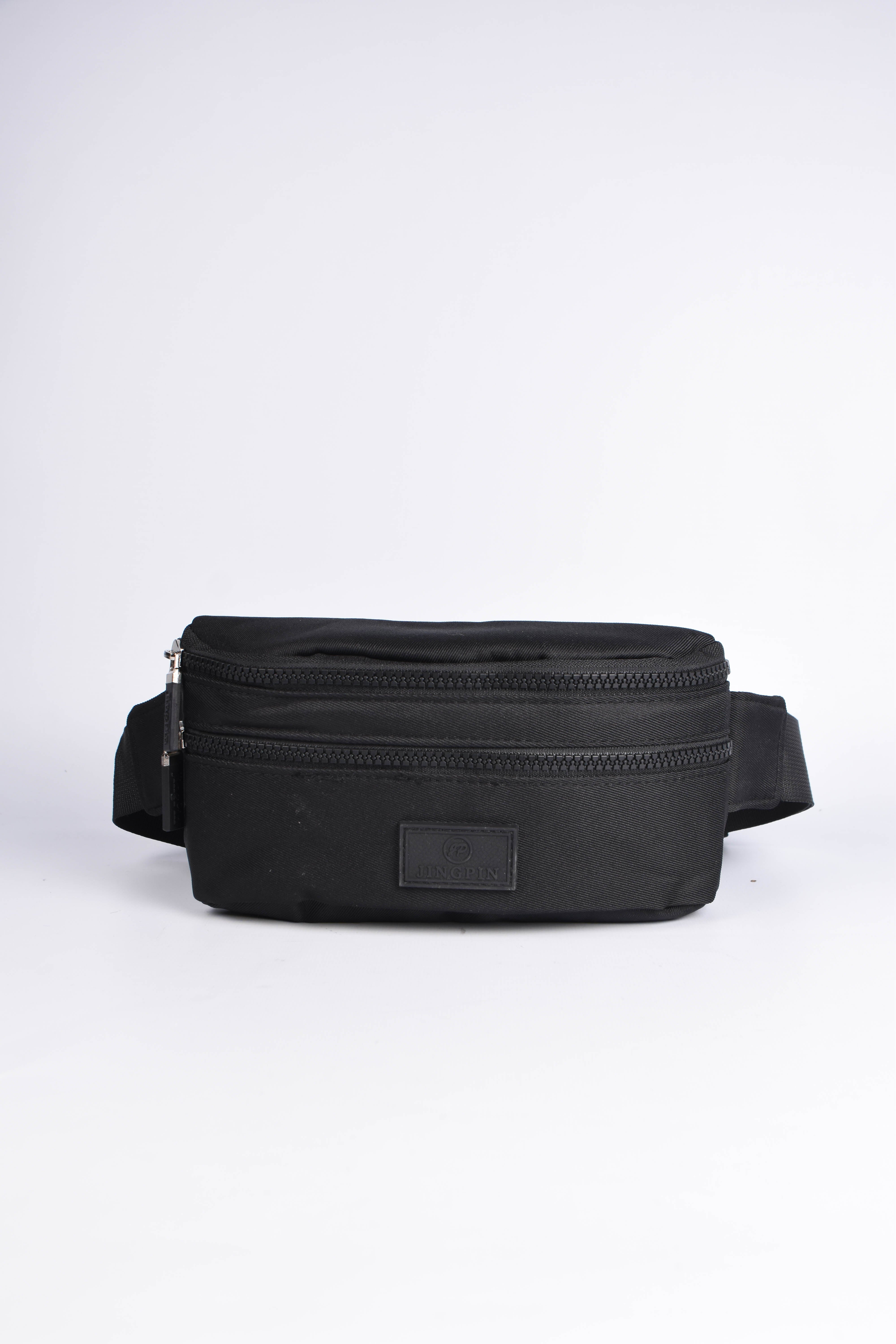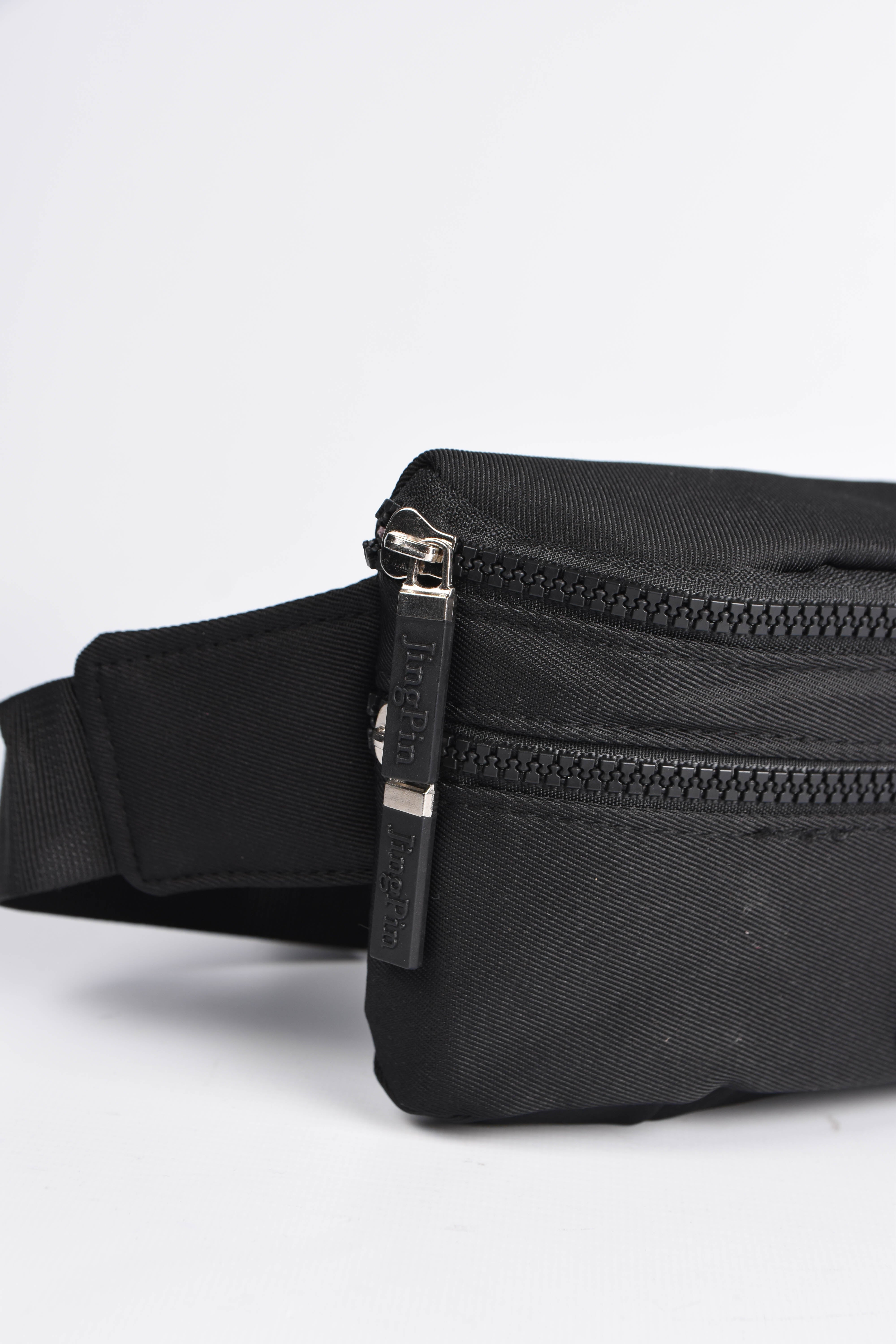 Riñonera negra con varios bolsillos de compartimiento.