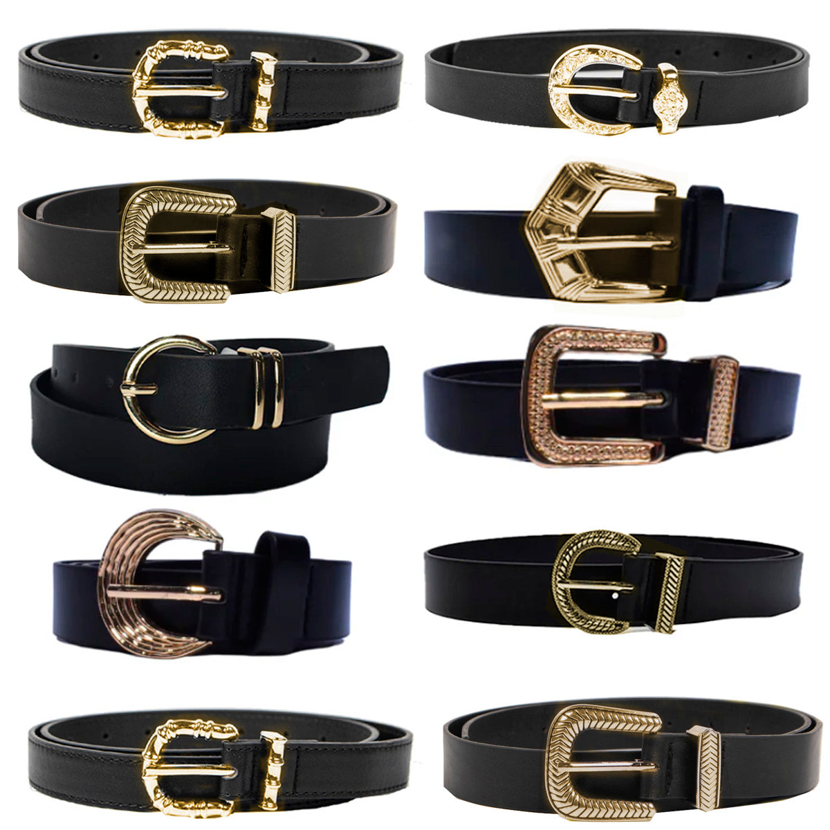 Contiene diez cintos importados con hebilla dorada de diferentes modelos.