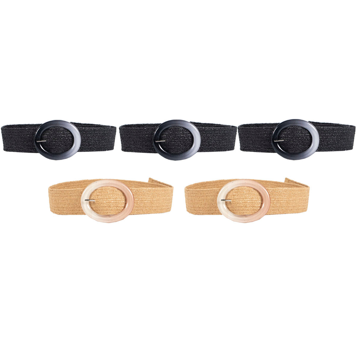 Contiene 5 cintos de rafia de un mismo modelo, vienen 3 negros y el resto de colores surtidos.