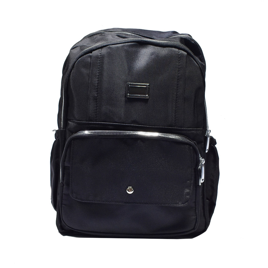Cuenta con varios cierres en color plateado y detalle de chapita en la parte delantera