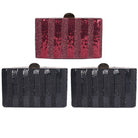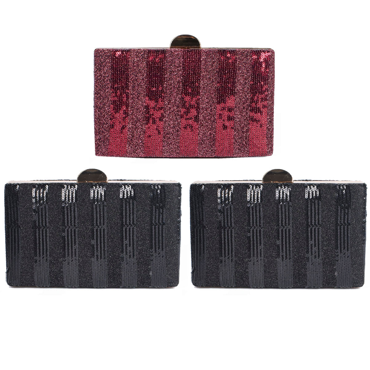 Contiene 3 sobres clutch de fiesta con lentejuelas, vienen 2 negros y 1 rojo.