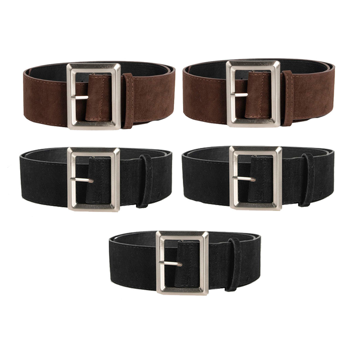 Contiene cinco cintos de un mismo modelo mixto con hebilla plateada.
