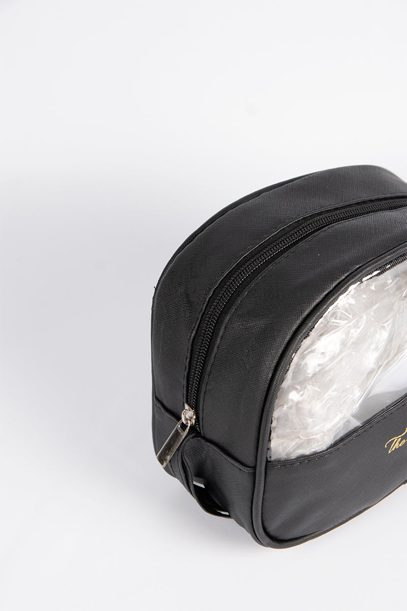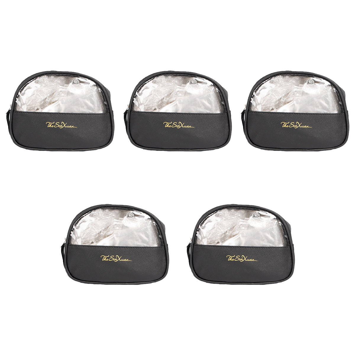 Contiene cinco portacosméticos de un mismo modelo en color negro.